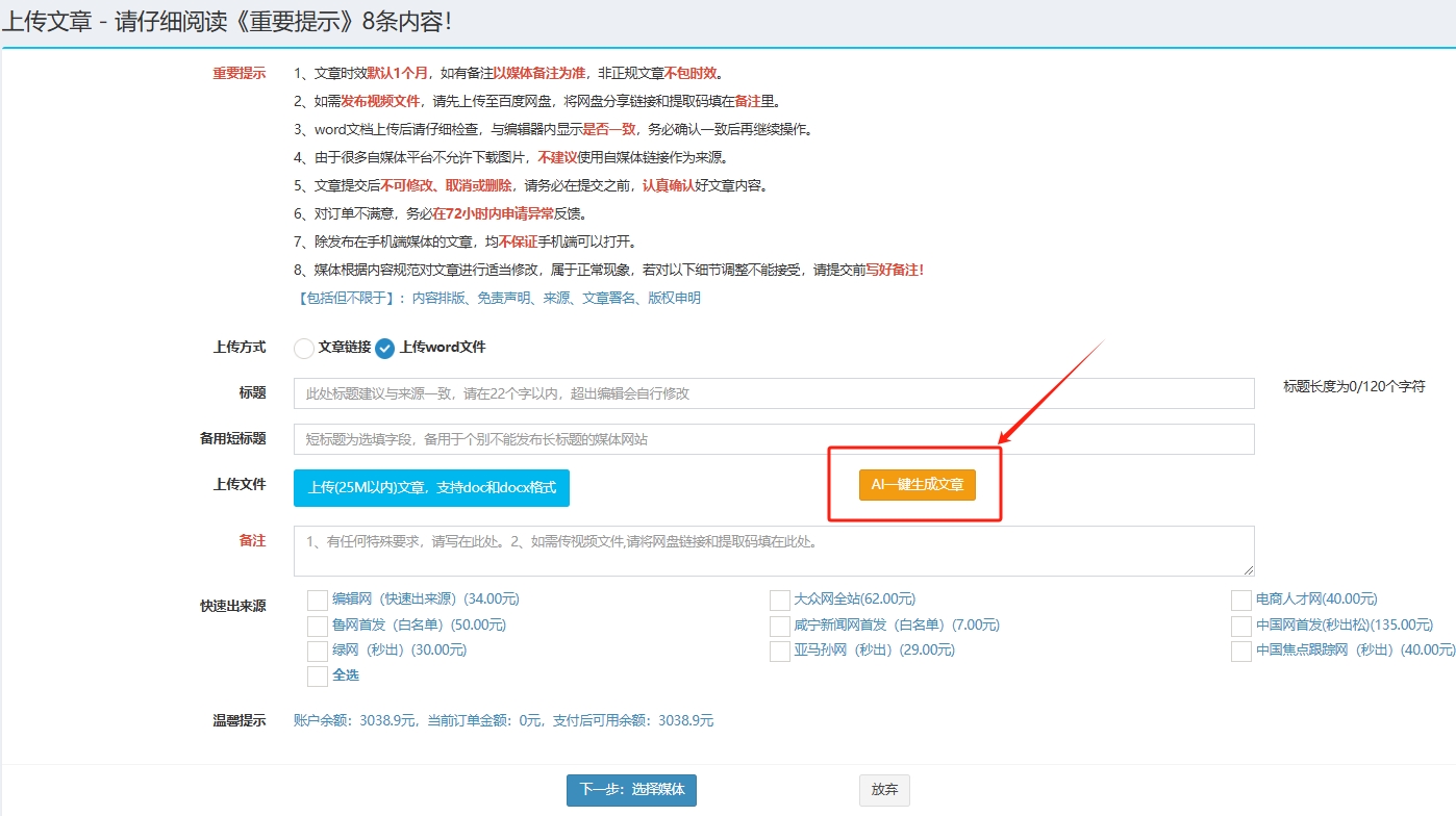 進入【上傳文章】頁面,傳好文章后,勾選【編輯網(wǎng)(快速出來源)】,立即支付即可!