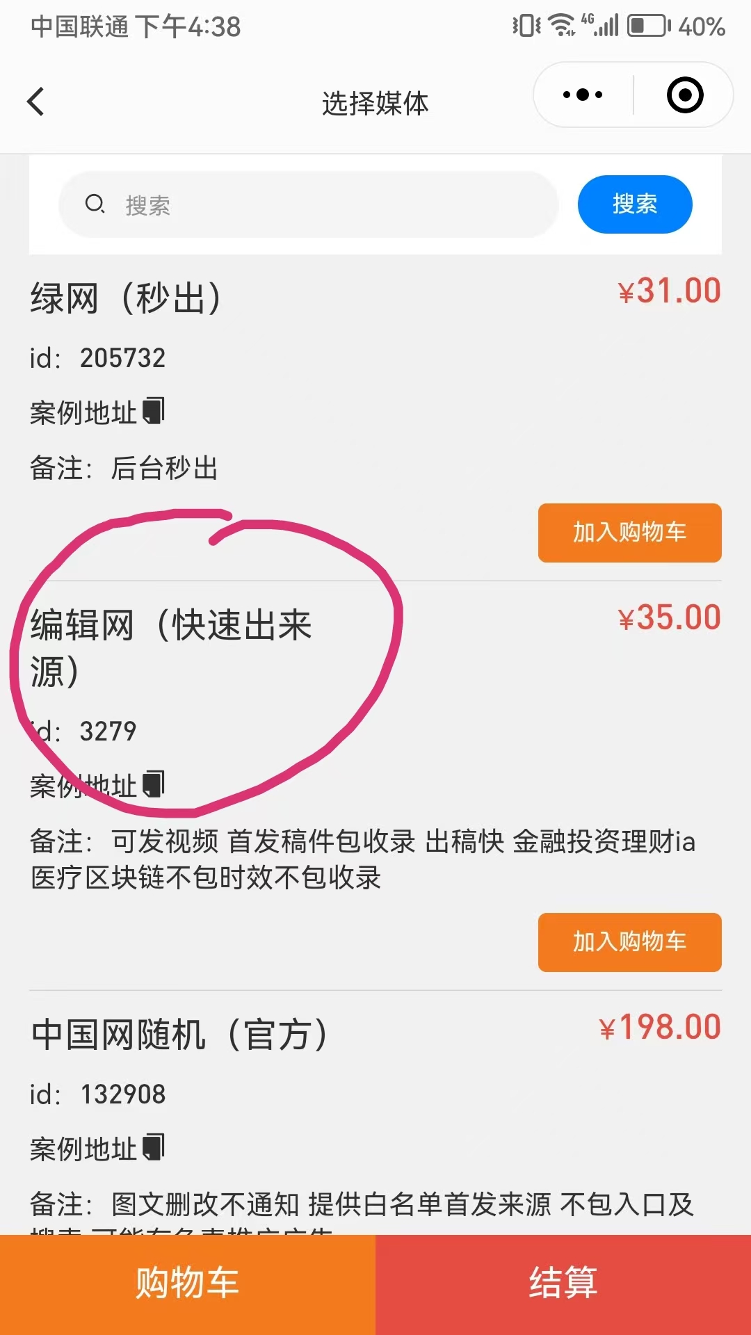 進入小程序首頁,傳好文章后,進入【選擇媒體】頁面,將【編輯網(wǎng)(快速出來源)】加入購物車,結算即可!